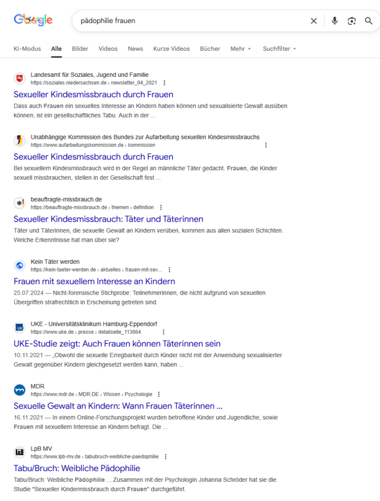 Ich habe dann diesen Nutzer aufklären wollen, und dazu eine Google Suche nach weiblicher Pädophilie gestartet, hier ist das Ergebnis ->